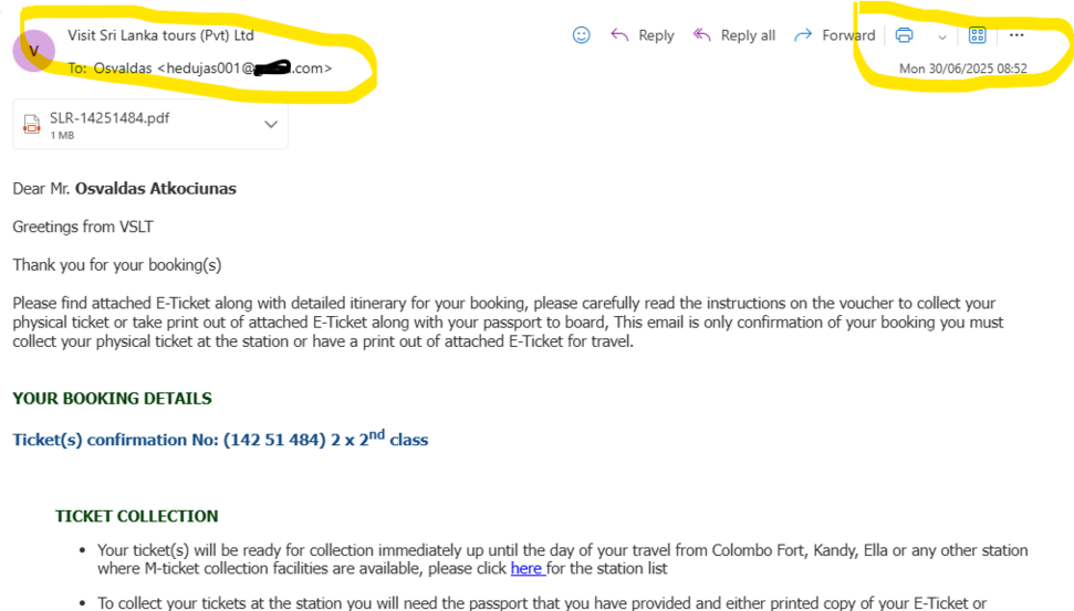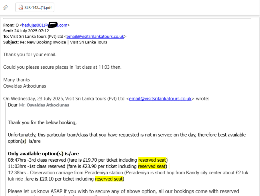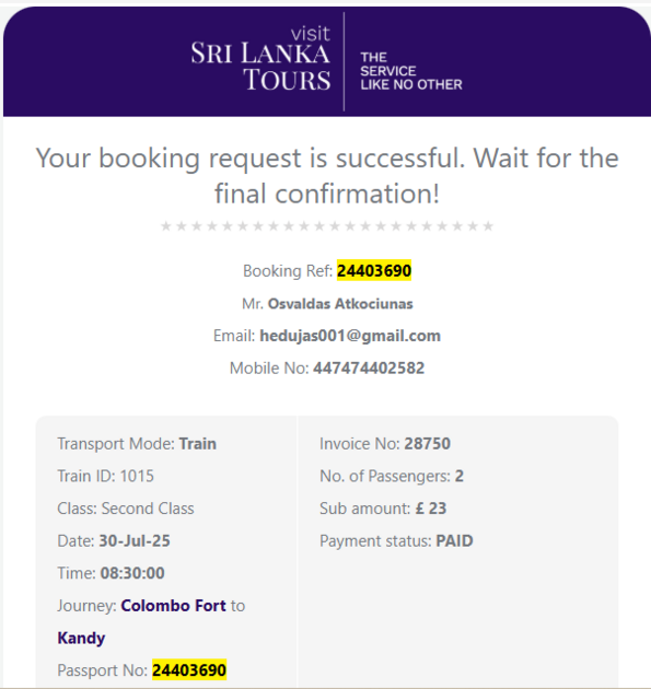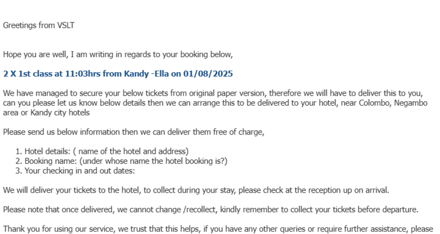 We have managed to secure your below tickets from original paper version, therefore we will have to deliver this to you, can you please let us know below details then we can arrange this to be delivered to your hotel, near Colombo, Negambo area or Kandy city hotels